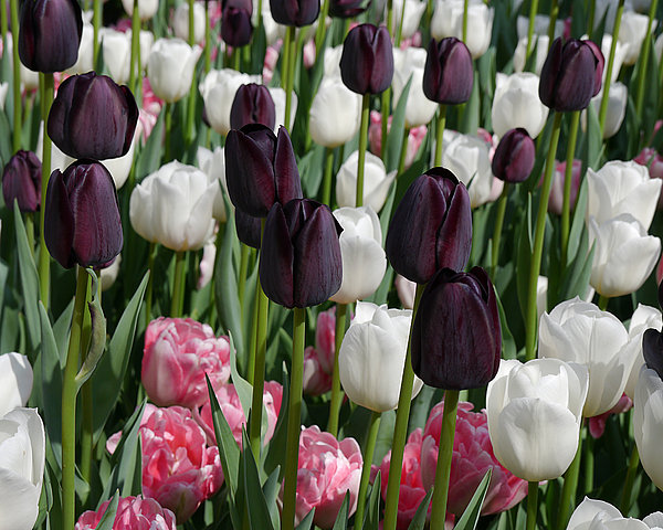 A display of while, pink and black tulips at Longwood Gardens, Pennsylvania